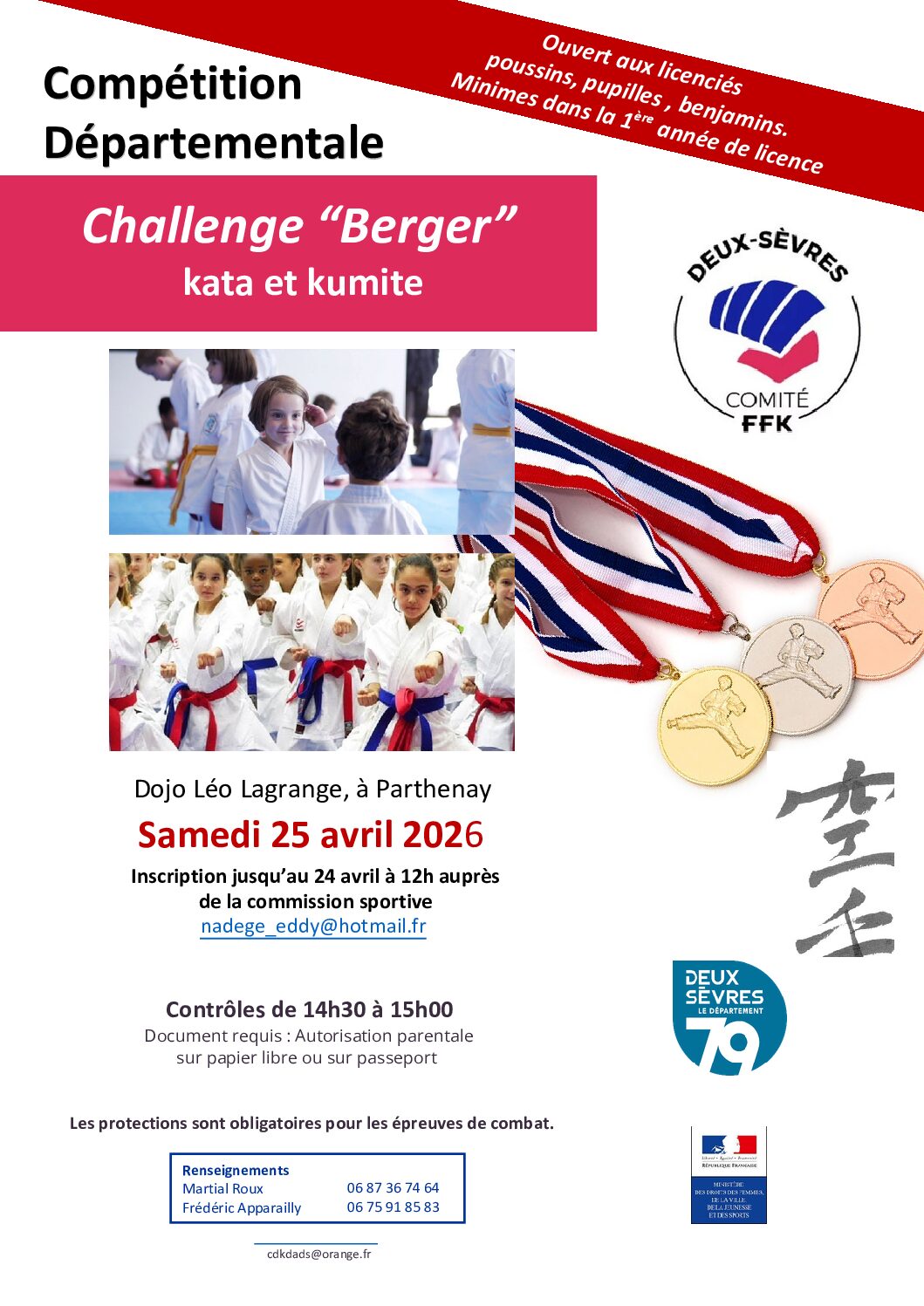 Le Challenge Berger aura lieu le samedi 25 avril prochain (affiche en pièce jointe) à Parthenay (début : 14h30). Il s’agit d’un challenge karaté (kata et combat) à destination des débutants et des plus jeunes : – Poussins (années de naissance 2018-19), – Pupilles (2016-17) – et Benjamins (2014-15) qui ont un maximum de 2 licencesLa compétition est également … Lire plus